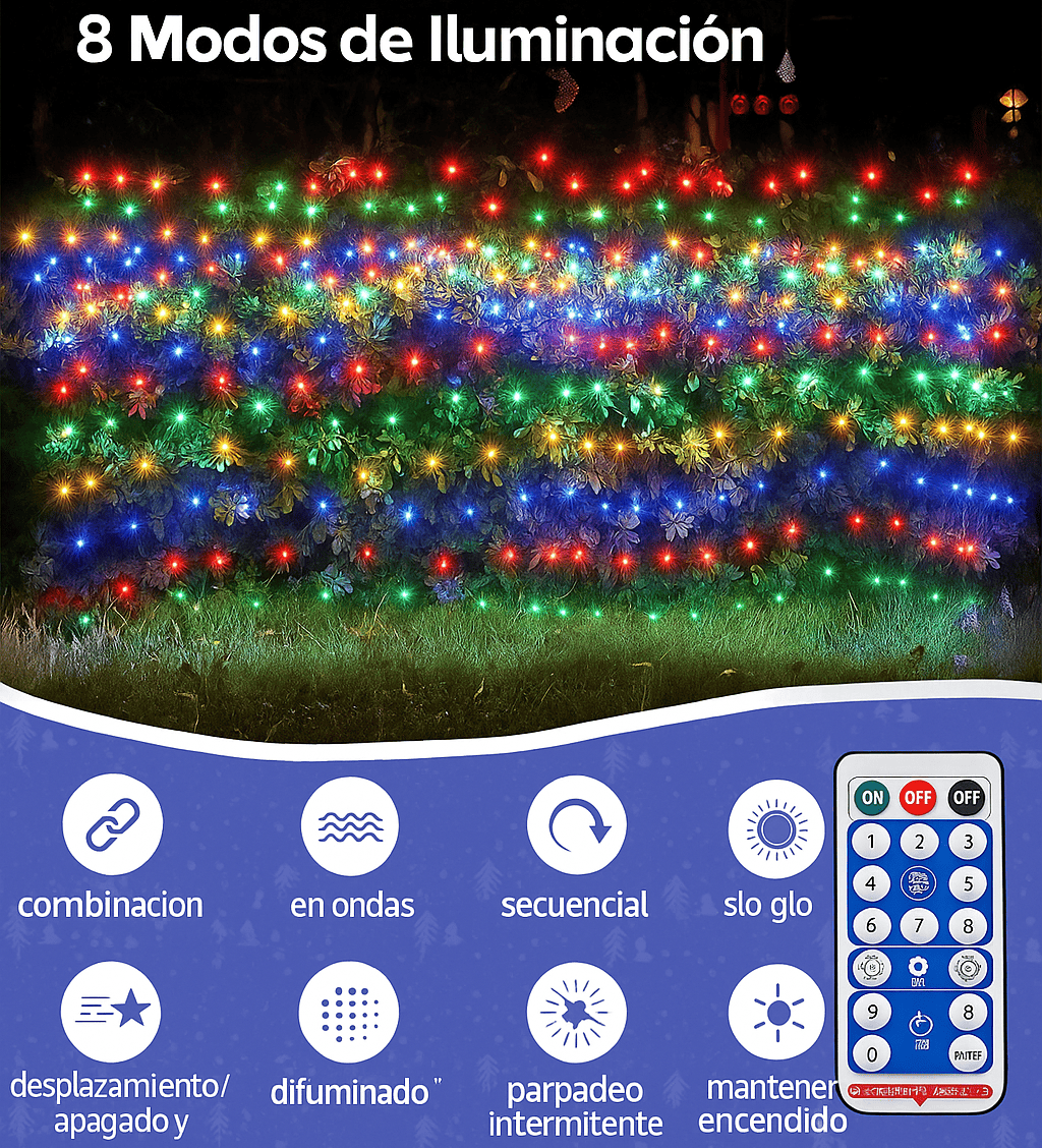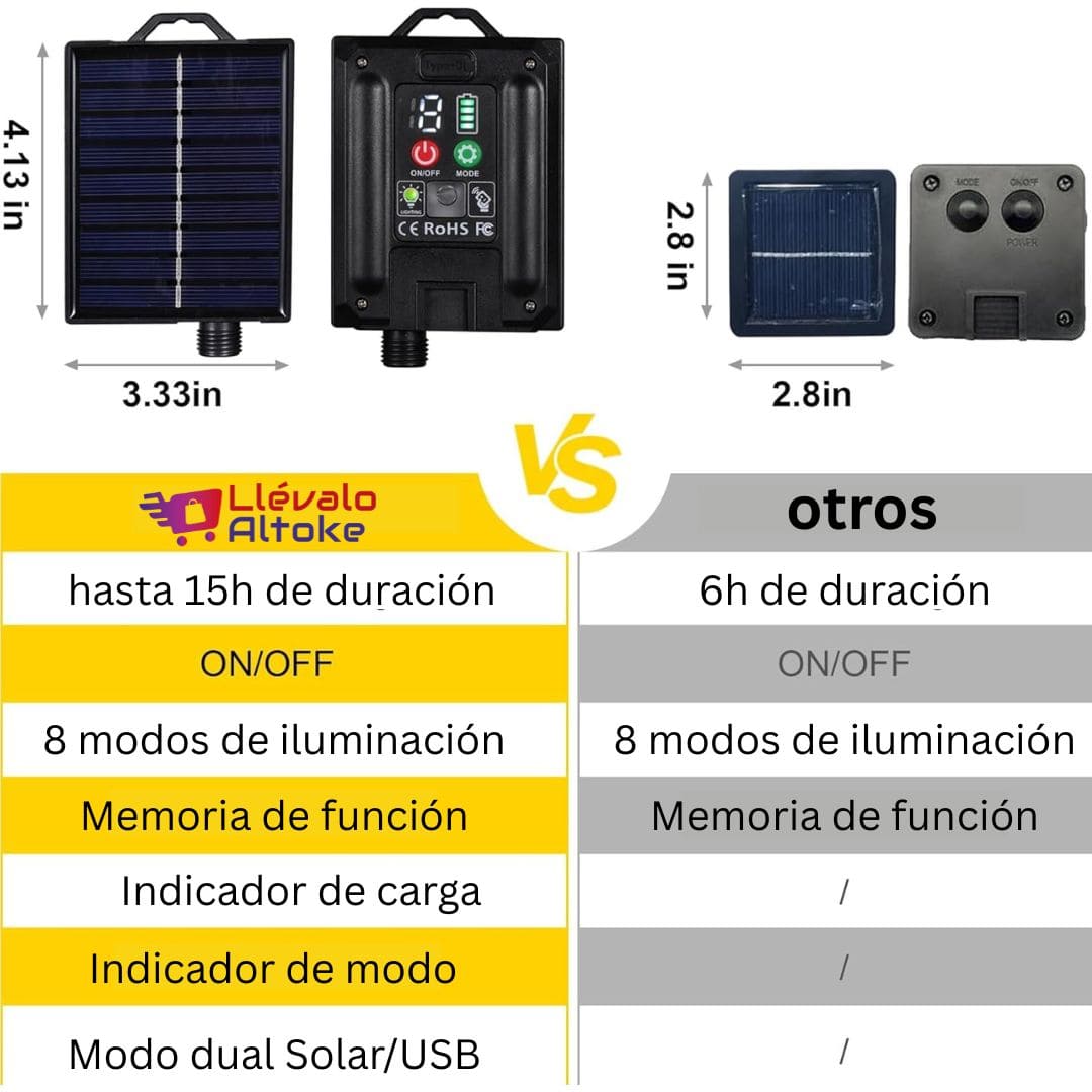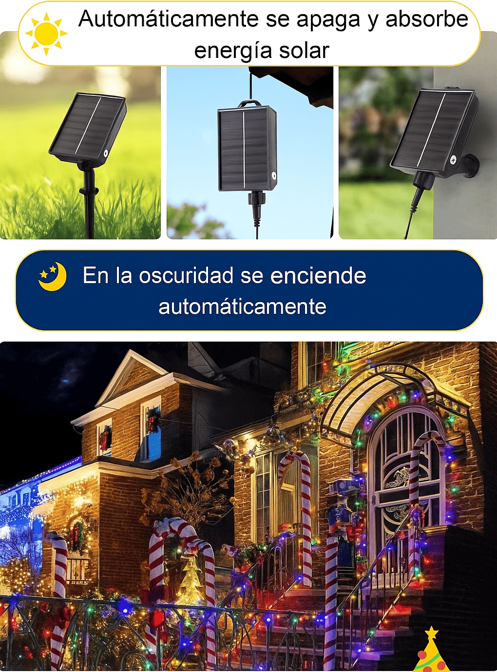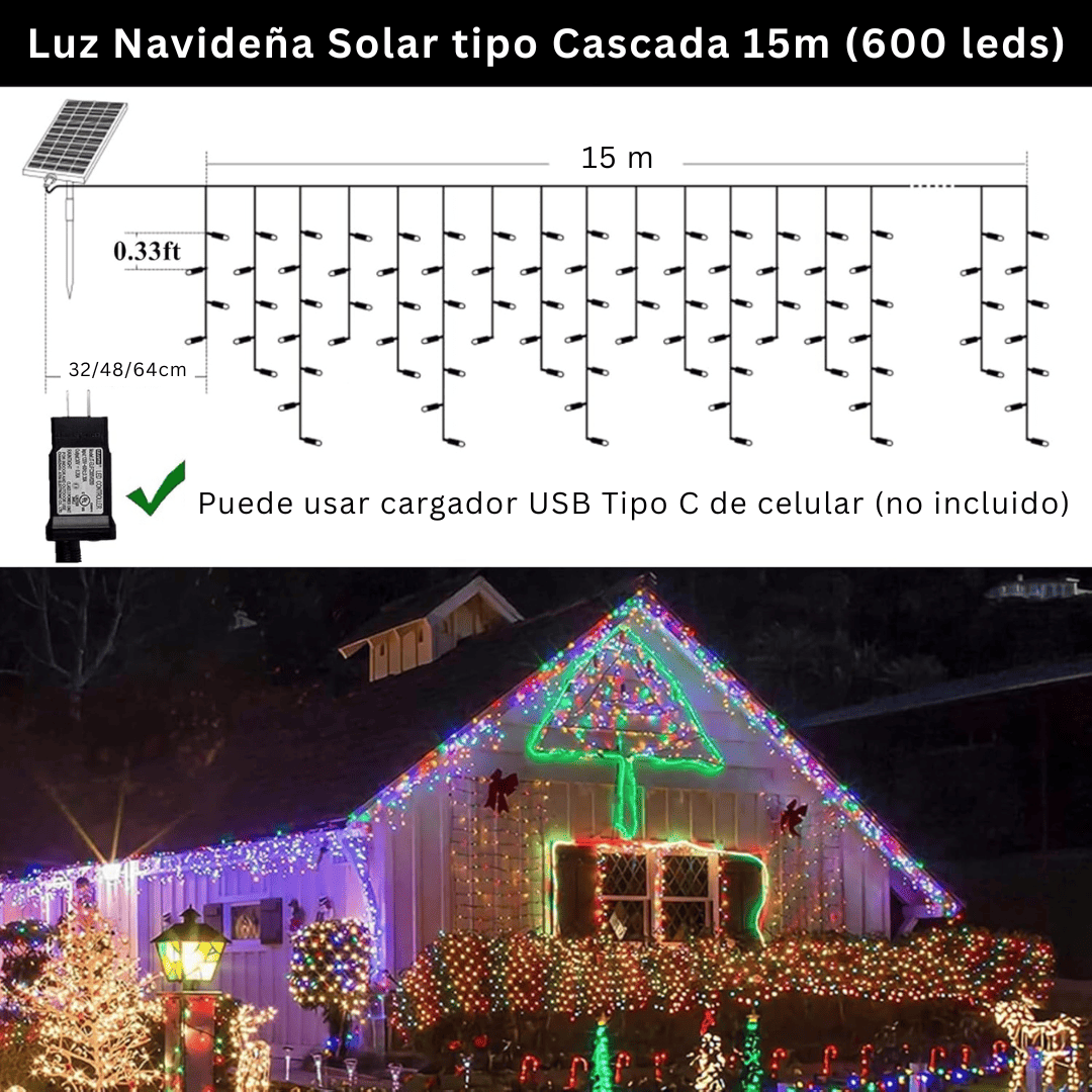 Decora tu hogar con la cascada navideña solar más práctica y modernas: 15 metros de largo con 600 LEDs multicolor, 8 modos de iluminación y control remoto. Funciona con panel solar + carga USB Tipo C. Perfecto para fachadas, ventanas, balcones y techos.