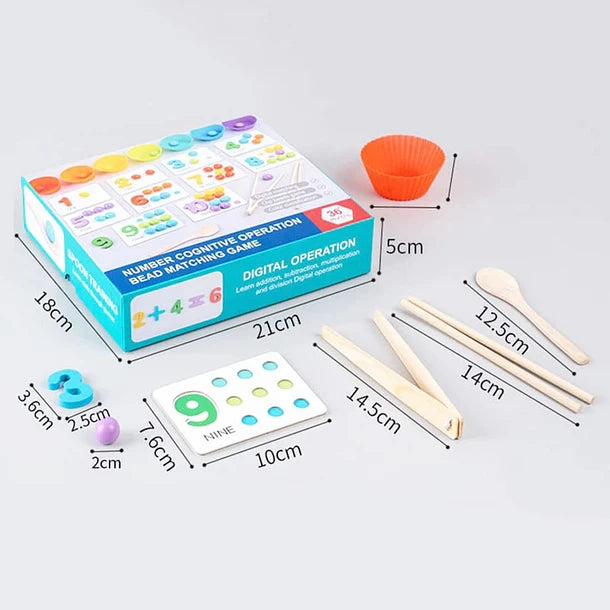 Este juego convierte los números en una experiencia visual y táctil. A través de cuentas de colores, tarjetas ilustradas y operaciones básicas, los niños aprenden a contar, sumar y asociar cantidades de forma divertida y natural. Ideal para introducirlos al mundo de las matemáticas sin frustraciones.