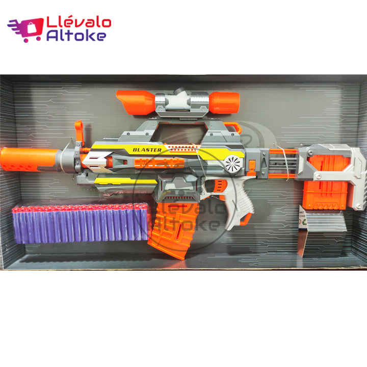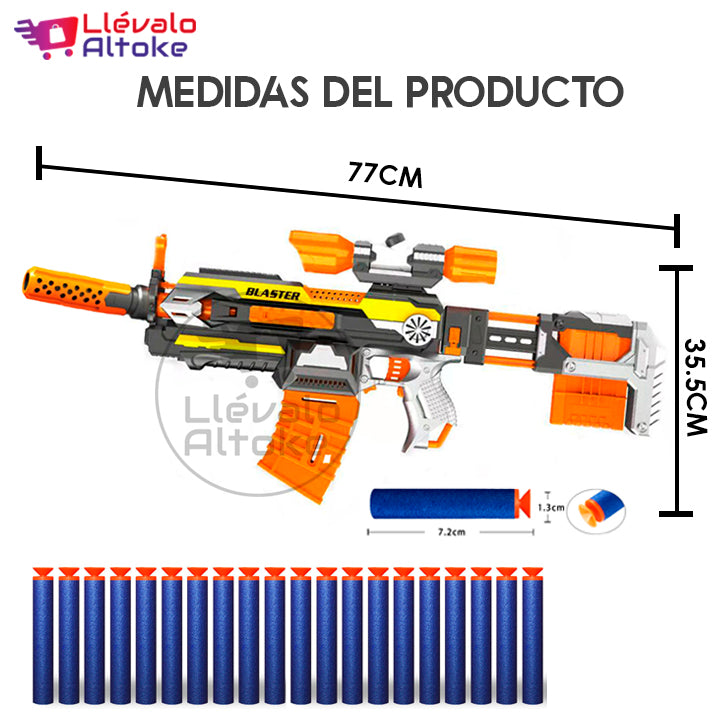 Incluye 6 accesorios desmontables, que pueden ser de hasta 80 cm de largo cuando lo montas. Está equipado con doble cargador de alta capacidad, permite recargar rápidamente cuando te quedas sin dardos.