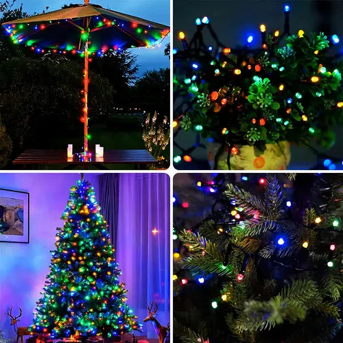 Decora tu hogar con las luces navideñas solares más prácticas y modernas: 33 metros de largo con 500 LEDs multicolor, 8 modos de iluminación y control remoto. Funciona con panel solar + carga USB Tipo C, además de ser impermeable y perfecta para exteriores.