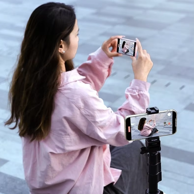 Deja de adivinar cómo sales en tus fotos y videos. Usa la cámara trasera de tu móvil para una calidad increíble. Nuestra pantalla se monta magnéticamente y viene con control remoto para que cada toma sea perfecta.