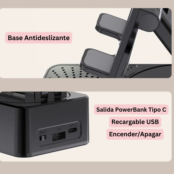 Disfruta de tus videos y llamadas gracias a su rotación de 360° y su sonido nítido y volumen profundo. Además, mantén tu dispositivo cargado con su función de Power Bank Auxiliar.